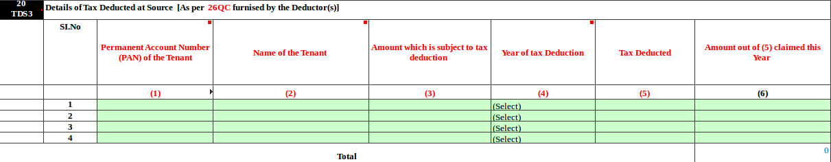 - Amount out of (column 5) claimed this Year – It means out of the total amount of tax deducted for the relevant year, how much is to be claimed in this assessement year. The remaining amount is allowed to be carried forward in future years. For example TDS deducted in FY 2017-18 is Rs. 200 and claimed in this year is Rs. 150, then amount in column 5 will be Rs. 200 and column 6 will be Rs. 150. Hence remaining Rs. 50 will be allowed to carried forward in next year.