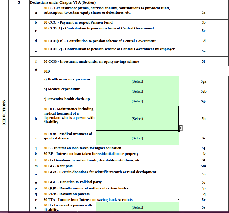 5. Deductions under Chapter VI A – Item No. 5 – Headings of Various deduction sections from 80C to 80U has been clearly specified. Section 80D has been further sub classified under: