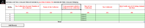 Item No. 22 TCS : Details of Tax Collected at Source [As per Form 27D issued by the Collector(s)] : Column (3) Gross payment which is subject to tax collection is to be provided in place of Amount which is subject to tax collection. Column (6) TCS Credit out of (column 5) being claimed this Year is to be provided in place of Amount out of (column 5) being claimed this Year.