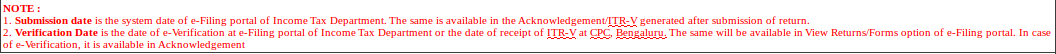 Submission Date is available in the ITR-V / Acknowledgement generated after submission of return. Verification date is the date of Receipt of ITR -V at CPC. In case of e-verification, it is available in the Acknowledgement.