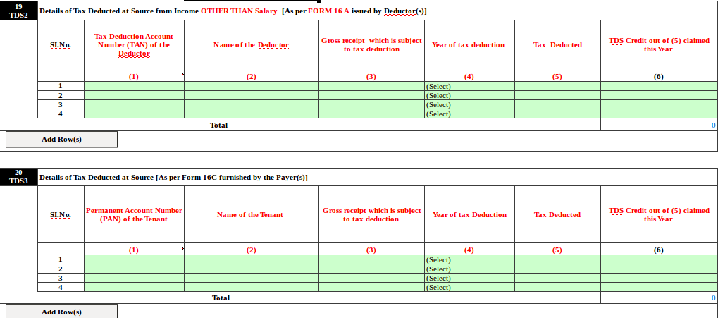 Item No. 19 TDS2 Details of Tax Deducted at Source from Income OTHER THAN Salary [As per FORM 16 A issued by Deductor(s)] and Item No. 20 TDS3 Details of Tax Deducted at Source [As per Form 16C furnished by the Payer(s)] :