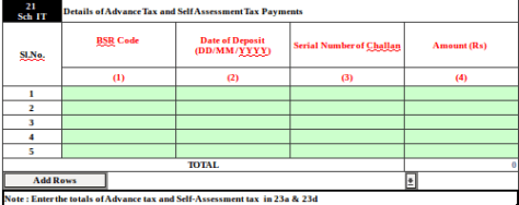 Item No. 21 Sch IT: Enter all the Advance tax and Self-Assessment tax details.