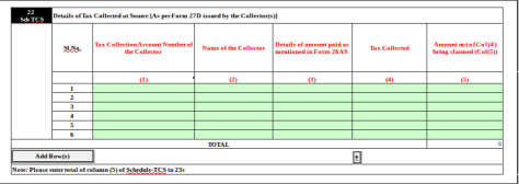 Item No. 22 Sch TCS: Details of Tax Collected at Source [As per FORM 27D issued by the Collector(s)] : Column for amount claimed in the hands of spouse, if section 5A is applicable, has been removed.