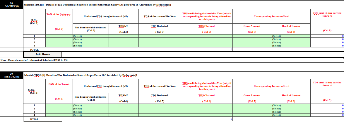 b. Item No. 20 Sch TDS 2(ii) Details of Tax Deducted at Source [As per Form 16C furnished by the Deductor(s)] have been completely changed. New TDS Schedule needs below details: